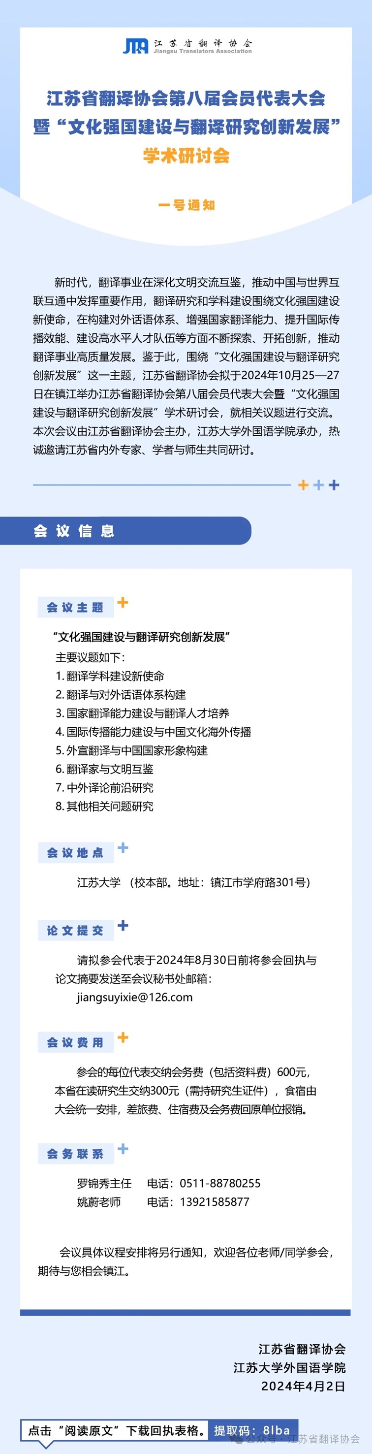 江苏省翻译协会第八届会员代表大会暨学术研讨会(1号通知)