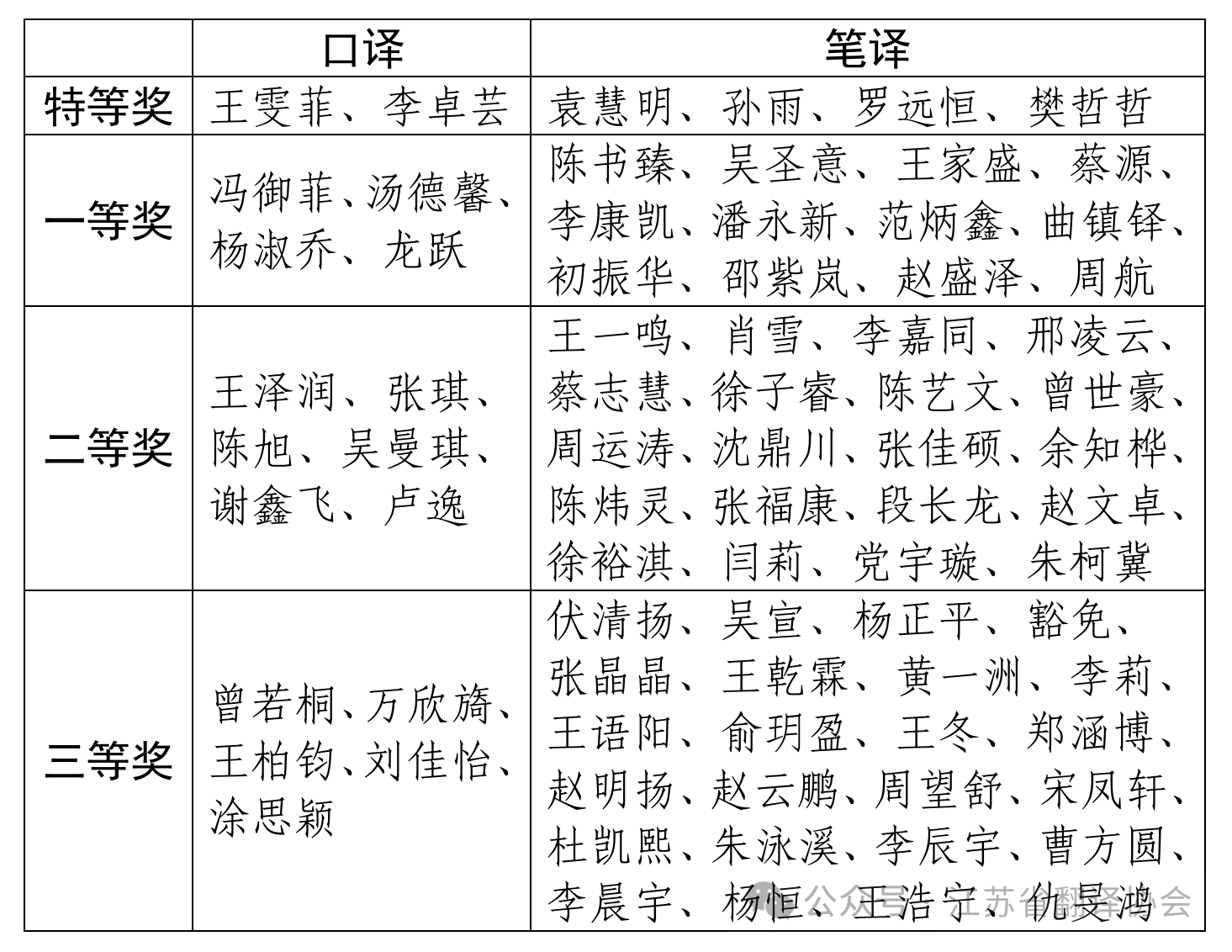 第十七届“板桥杯(Bambridge)”青年翻译竞赛由江苏省翻译协会主办,国防科技大学外国语学院承办,本届比赛分笔译和口译两项子赛事。笔译竞赛经过专家三轮匿名审稿,评选出60名获奖选手,其中特等奖4名,一等奖12名,二等奖20名,三等奖24名。口译竞赛共评选出特等奖2名,一等奖4名,二等奖6名,三等奖5名。获奖名单如下: